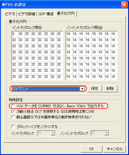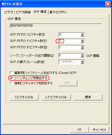 標準より、Pピクチャの数を減らしました。ここの設定は、ソースと必要な圧縮率により決めてください。