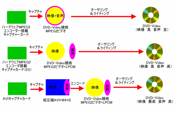 低圧縮AVIキャプチャとハードウェアエンコーダー搭載MPEG2キャプチャのDVD-Videoの作り方の略図です。