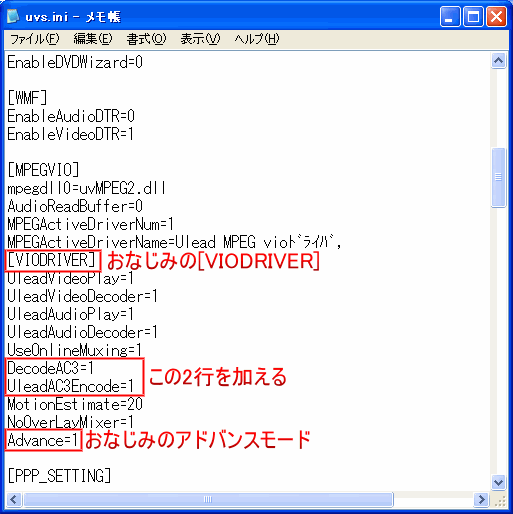 Movie Writer Advance SEがインストールされた状態で、VideoStudio7SEの「uvs.ini」をいじります。