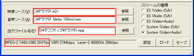 まずは、m2vかd2vを映像ソースとして読み込み、音声ソースはAACをWAVE化したものを選択します。