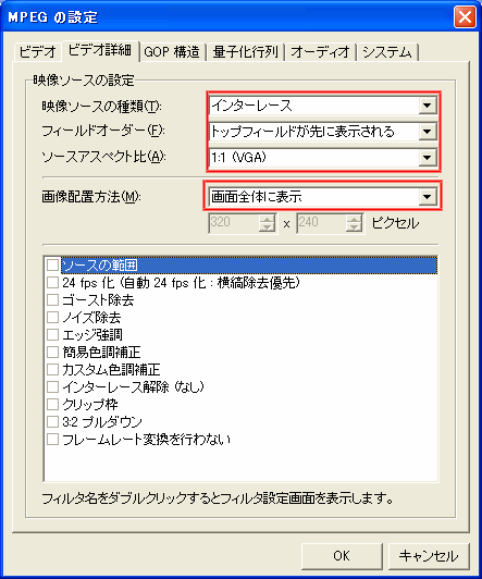 ソースの設定ができたら、GOPや量子化行列や音の設定をしてください。