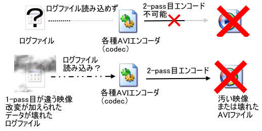・1-pass目ではAVI動画本体を作らなくて、作ってもダミーファイルです。1-pass目はログファイルが本体です。