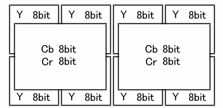 横方向に4つのピクセルが色差を共有します。1ピクセルあたり12bitになります。