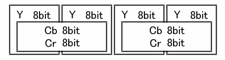 2つのピクセルが色差を共有してデータを減らす方式です。1ピクセルあたり16bitになります。
