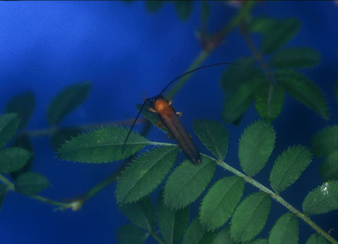 成虫は明るい日陰の,ヤブニッケイやクロモジの若木の葉裏の主脈や支脈を後食しています.