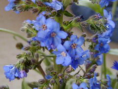 属名のアンチューサ(Anchusa)は、ギリシア語で「化粧料」「皮膚に塗る」と言った意味を示しています。一般に流通している薬用ハーブ「アルカネット」はAnchusa officinalis≠ナofficinalis≠ニは薬用の意味を持ちます。Alkanna tinctoria≠ヘ根に赤色色素を持ち染料に用いられています。tinctoria≠ニついたものは「伝統的な染料植物」の意味ですね。また、「アンチューサ」の名で流通しているのはAnchusa capensis≠フ園芸種「ブルーチャーム」が多いようです。他に鑑賞用として花穂の長いAnchusa azurea≠ネどもあります。なんだかややこしいですね。