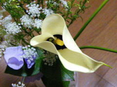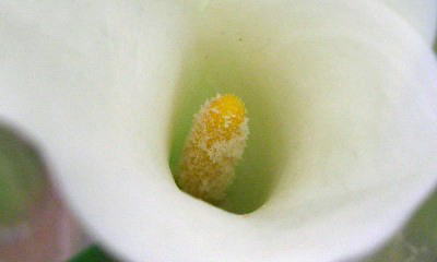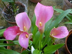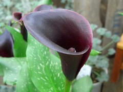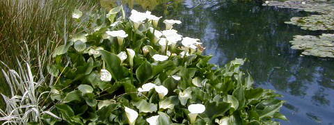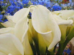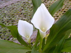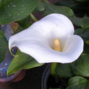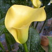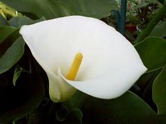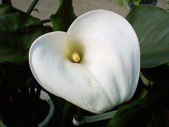 白く清楚なイメージから、結婚式で花嫁のウェディングブーケによく使われたりします。カソリックの尼僧がつけるカラー(襟)がこの花に似ていることからこの名が付けられた言われています。ザゼンソウ、マムシグサ、ウラシマソウ、カラスビシャク、ミズバショウなどと同じサトイモ科なのですが、その仏炎苞を美しさから広く親しまれ、品種改良が進められていてきました。オーソドックスな白花を基本としたの湿地性の「オランダカイウ」、やや小さめの黄花系の畑地性「キバナカイウ」などがあります。 |