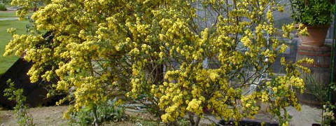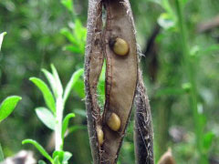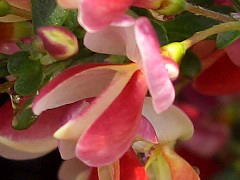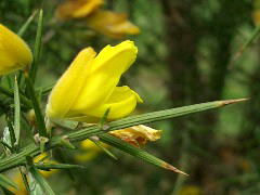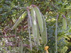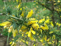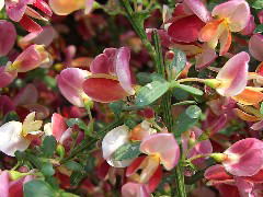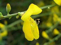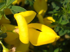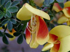 この花でユニークなところは受粉のシステムで、下の花弁(翼弁:よくべん)に虫(ハナバチ)が乗ると、その重みで花弁が割れて雄しべと雌しべがピョコンと飛び出して虫の体にに花粉を付けるという仕組みになっています。ですから、花から雄しべ・雌しべが見えているものは「使用済」ってことになりますね。指でちょっと押しても弾けますが、面白半分でやっちゃうのは避けましょうね。園芸店でもみかけますが、落葉低木なので育てるとけっこうな大きさになります。 |