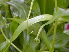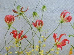 暑い夏に咲く花。切断分球で10月頃堀上げて翌年春に植え付けます。寒さはにがてなので冬越しの寒さには要注意です。花保ちがいいので切花としてよく見かけますね。派手さのある花です。葉の先端が巻きひげになっていて、これを絡ませて伸びていく蔓性の植物です。