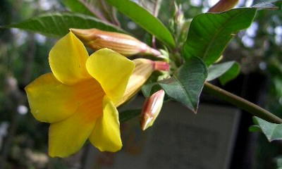 熱帯性のつる性植物なので寒さには弱い植物です。初夏に濃い黄色のラッパ状の花を咲かせます。
