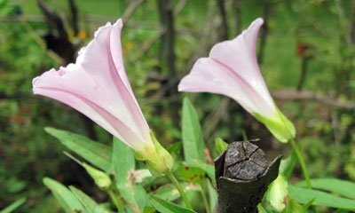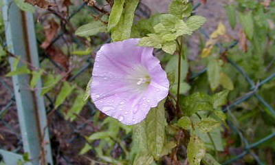 ヒルガオ科の親分ですが、朝顔・夕顔などとくらべるとしっかり雑草化していますね。「ヒルガオを採ると雨が降る」って言われていますが、そう言われると採りたくなるものでついつい手をのばしてしまうのですが、翌日になると雨が・・・降るんですね、不思議と.....。自然の驚異ってやつでしょうか? 一日中咲いているので「昼顔」と名づけられました。インパクト薄い由来ですね。若葉や若芽はお浸しや和え物などでいただけますが、種などにLSDに似た幻覚作用を持つ物質を含みます。 |