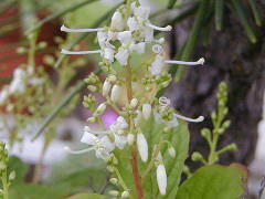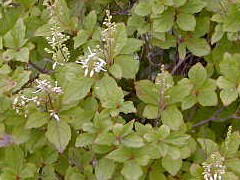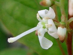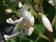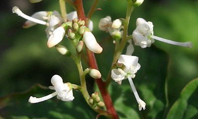 夏から秋にほんのり紅をさした白色の花をつけます。木丈は2mほどの落葉低木で、山地・高原に群生しています。葉や花にも毒性があって、その蜜にも同じように毒性を持ちます。古くは葉を便槽に入れて蛆殺としても用いられていました。刈った枝を束ねて箒をつくることから「ヤマボウキ」の別名もあります。