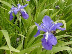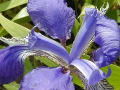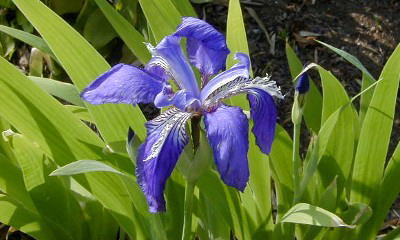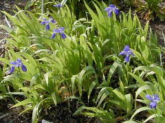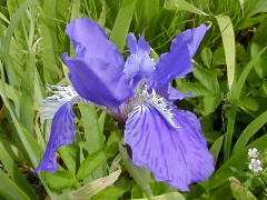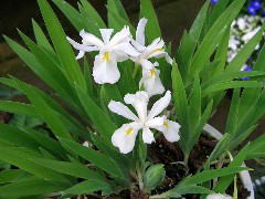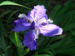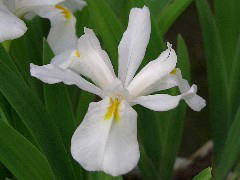 アイリスの仲間のなかでも一番最初に花を咲かせるところからこの名(一初)が付きました。根茎(鳶尾根=えんびこん)は薬効があり、食中毒等の下剤として利用されていました。花の真ん中から出ている白に紫の斑点が入った突起状ひだひだがこの種の特徴。葉もちょっと広めですね。 |