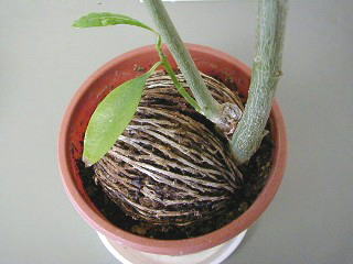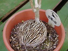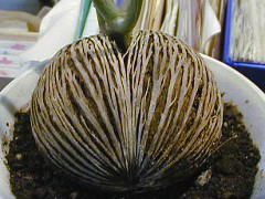 「恐竜の卵」の名で多く出回っていますね。水栽培も可能ですがかなり大きくなってきます。ただ、水栽培に使った水や若芽などを誤って口に入れたり、大きくなりすぎて邪魔になったからって庭などで燃やしちゃったりしないように注意しましょう。ラベルの裏にでも注意書きがあるといいんですけどね。 |