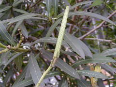 花の後、このような実があちこちにできます。東京多摩地区では、刈り取った夾竹桃を牛に与えしまい死なせたという事故もありました。