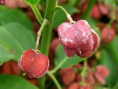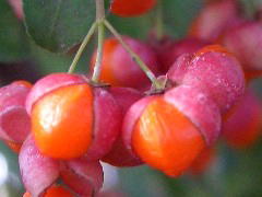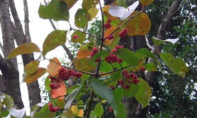 雌雄異株の落葉低木で秋に赤い実をつけます。新芽は隠れた山菜とされていますが、実は有毒なのでつい誤食してしまうそうです。 |