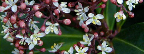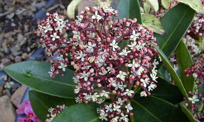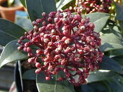 ミカン科 ミヤマシキミ属、雌雄異株の常緑小低木