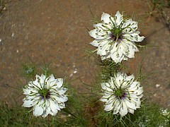 | いろいろ咲いています。いわゆる、ミックスというもの。特徴的な細い葉は、「ビーナスの髪」と呼ばれています。また、「Devil in a bush(茂みの中の悪魔)」という興味ある英名も持っています。 |