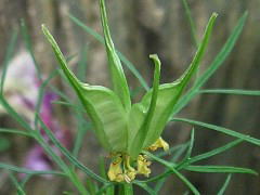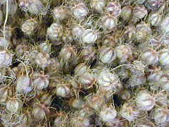 | この実の中にゴマのような種がビッシリ詰まっています。学名の「Nigella」はラテン語の「Niger=黒い」を意味し、和名の「クロタネソウ」にも通じていますね。ニゲルエールというほんのり甘い芳香成分が含まれていて、古くから香辛料として広く利用されていますが、有毒成分も含まれますので多食は禁物です。 |