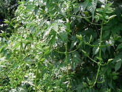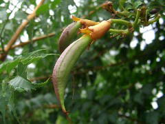 よく庭先で栽培されていますが、花の汁液が肌に付くとかぶれを起すことがあります。誤って目に入るととても危険です。貝原益軒(1630-1714)は著書『花譜』の中で「凌霄花:其つる長数尺のとき、木を得てよぢのぼり、松の木に多くははゝしむ。藤かづらのごとし。花黄赤色なり。夏秋花ひらく。花を鼻にあてゝかぐべからず。脳をやぶる。花上の露目に入れば、目くらくなる。」と書いていますが、これはちょっと大げさですね。 |