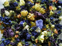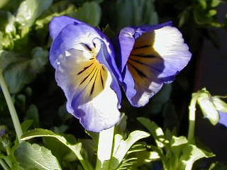 綺麗な薄紫色です。いろいろな色があってキリがないですね。フランス語のパンセ(もの思い)からパンジーという名が付けられたといわれていますが、花の姿や柄が物思いに沈んだ人の顔のようにも見えるからでしょうか・・・。ビオラとともに「人面花」とも呼ばれているそうです。シェークスピアの「真夏の夜の夢」では媚薬としての効果が語られていて、パンジーの花の汁を眠っている人の瞼につけると、目を覚ましたとき最初に見たものに恋をしてしまうといわれています。そして、これを解くにはヨモギとセイヨウニンジンボクから作った薬を塗ります。 |