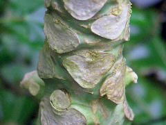 おなじみのトロピカルフルーツ、パパイヤです。未熟果は抗炎症薬や消化薬の製薬原料にされています。見かけは木ですが内部組織は木質化していないため、大きくなる草の仲間とされています。