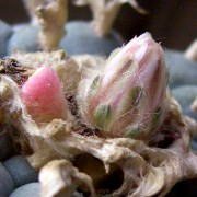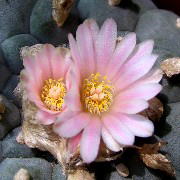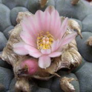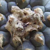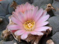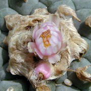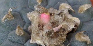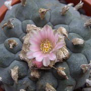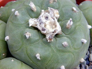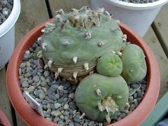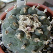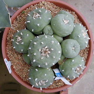 「ペヨーテと呼ばれるサボテンを食べたり飲んだりすると、ものすごく恐ろしいか、あるいはとてつもない馬鹿ばかしい幻覚が生じる」ベルナルディーノ・デ・サハガン(16世紀の宣教師)。「鳥羽玉(ウバタマ)」「トゲ無しサボテン」とも呼ばれ、サボテン愛好家には人気ですね。春から夏にかけて小さな薄紫色の花を咲かせます。 |