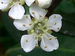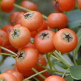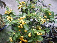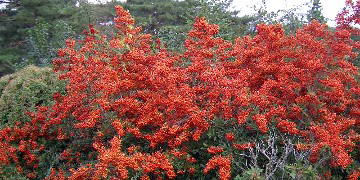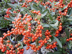 トゲを持つ植物です。よく庭木で使われていて、冬になると小さな赤い実をたくさん付けます。赤い実は毒性を持つうえに苦くまずいので、鳥たちは一気に食べることをせずに少ずつしか食べなくなります。すると、実も少しずつあちこちにばらまかれることになるので、結果としては繁殖に有利となります。赤く不味い実の知恵ですね。(おいしい実は少しずつ熟す。) |