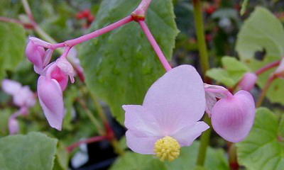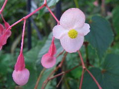 | ベゴニアの名前でも出回っていて、庭などで多く栽培されています。秋にカイドウに似た花を咲かせるので「シュウカイドウ」との名前が付きました。最初に咲くのが雄花で、遅れて咲くのが雌花。 |