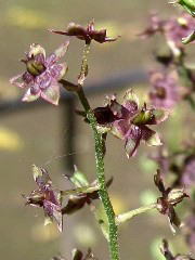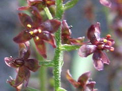 黒紫色の小花を穂のように付けて咲きます。アオヤギソウにそっくりですが、小豆色の質素な花を咲かせます。根を粉しにて農作物の害虫駆除薬として用いたりもします。茎の根元にシュロ(ヤシ科:Trachycarpus fortunei)のような毛がつくところからシュロソウ(棕櫚草)の名前となりました。アオヤギソウの変種。
