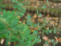 日当たりのよい道沿いや草原などに雑草化しているトウダイグサの仲間。折ると白い乳液が出ます。根は生薬での「大戟」で、下剤・利尿剤として用いられます。