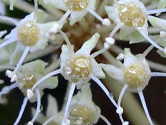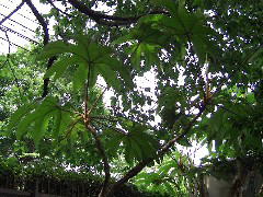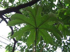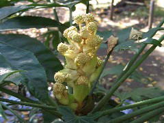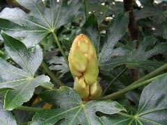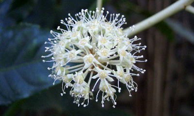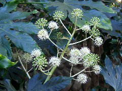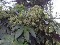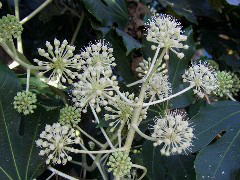 葉が手の形に似ていて切り込みの多いことを「八」の数字で表現して「八つ手」と名づけられています。毒性はあまり強くない。公害に強いので庭先や公園などでよく栽培されています。