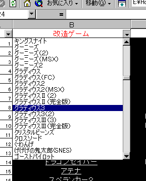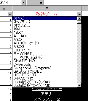 | Excelによるゲームタイトル検索方法 記事の数が増えちゃいましたから、ここでExcelによる検索のしかたをご紹介します。Excelって、みなさん持ってますか。Micro Softの表計算アプリケイションです。持っていないかたは・・・・何とかしてください(^^;; やりかたはカンタンです。 まず、ここを右クリックしてLISTをダウンロードしてください。(Excel、持っていますよね。・・・・シツコイ) ![]() ダウンロードしたファイルを開けば、頭はこんな風になっている・・・はず。 黄色で囲ってある下矢印を押せば・・・ ![]() こんな風に並び変わって見やすいようにリスト化されたものがあらわれます。 ![]() ここで見たいものを選んでクリックすれば、、 ![]() こんな風になって、記事の番号が示されます。あとは。。。。ですよね。 ![]() |