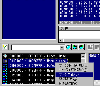 (1)立ち上げた状態でサーチ領域はModule areaとDefault Heapに設定されていますが、このふたつは今回はサーチ禁止にします。何故?ですか・・・うん、勘です。MAMEの場合、捜すデータはHeap2、Heap3、SubHeapにある場合が多いからです。けど、Nesticleなんかは結構Module areaとかなんかにありますけどね・・まあ、このあたりは経験が必要かもしれませんね。
