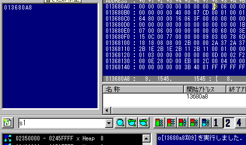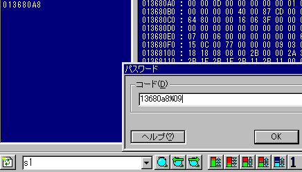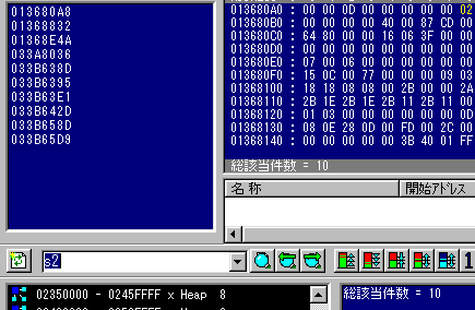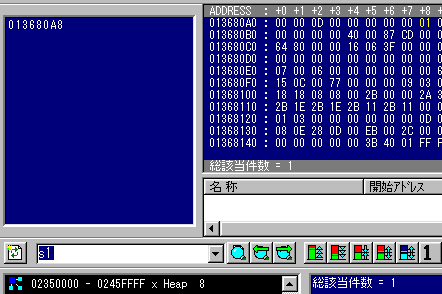 (6)アーサーを一機殺して(残酷や・・・・)今度は{s2}でサーチです。すると該当アドレスは一気に10個になってしまいました。ここまでくればみつかったも同然です。もう一機可哀想ですがアーサーを減らして{s1}でサーチです。結果は・・・見事に1カ所にしぼりこまれました。めでたしめでたし(^^;;あとはこれをコード化してアーサーを9機にして減らなくしちゃいます。