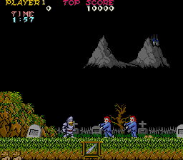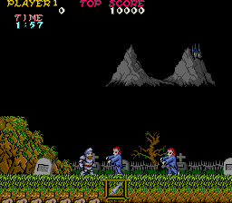 (4)まず、残機のサーチです。左画面がスタート直後の画面ですが、左下にアーサーが2機見えます(見難いですが)・・残機は3ということですからExSTANDで数値サーチします。