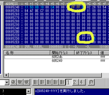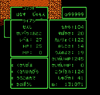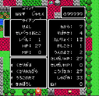 さて、今回はまだやっていなかった「ドラゴンクエストW」を使ってRPGの簡単改造法を勉強しましょうか・・これって本当に簡単なんです。だから取り上げたのですけどね(^^;;まず、タイトルです。格好いい・・とは言えませんが、当時としてはまあまああ、でしたか。 改造はお金と経験値です。これ以上やるとゲームが面白くなくなりますからね(と、イイワケ) 最初勇者ライアンは50ゴールドしか持っていません。だからExSTANDを立ち上げ、サーチ領域にHeap2、Heap3、SubHeapを追加し、領域クリアします。そしてサーチです。{m50}です。アドレスがズラッと出てきます。次に道具屋に買い物に行って8ゴールドの薬草を買います。残金は42ゴールドですから{m42}でサーチです。これだけでアドレスは一カ所に絞り込まれます。こんなに簡単なのは珍しい・・・でも、ラッキー(^^) だからここをFFFFに替えちゃいます・・・・・と、ゴールドは99999を表示して何でも買い放題。とりあえず、最初の街で買える最強の武器、防具を全部買い、装備します。でも、こんなにお金があるんだからもっと高くて強い武器、買いたいんだけどねぇ。(右図) さて、武器もそろったことですし、街の外の出て、敵と戦いましょうか。経験値を増やしてレベルあげたいですからね。 その前にExSTANDを再セットする必要があります。今、経験値は0ですね。ウン。 まず、サーチ領域の絞り込みです。さっきのお金をサーチしたアドレスがHeap2でしたから、ここだけをサーチ領域にして、他をサーチ禁止にします。そして、領域をクリアです。 ここで最初のサーチです。{m0}です。たくさんのアドレスが出てきます。これで一応準備完了です。街の外に出ましょう。 と、いきなり敵と遭遇。相手はかわゆいスライムちゃんです。可哀想ですけど、こっちは最高の装備、一撃でコロリです。 ![]() 経験値2が得られました。だからサーチします。{m2}です。該当アドレスは一気に2個になってしまいました。みればどちらが経験値を表示しているかわかるかもしれませんが、もう一回たたかいます。今度は2匹のスライムちゃんです。スライムちゃんと出会ったのは「ドラクエ」が最初でした。思えば長いつきあいですねえ。でも、やっつけちゃいます。ゴメンナハイ。で経験値を4獲得。さっきとあわせて経験値は6です。だからサーチです{m6}これでめでたく一カ所に絞り込まれました。 ![]() これで勇者は一度戦えば、どんどんレベルが あがっていき・・・(レベルがあがっていってい る画面が下図です) ![]() ほとんど戦わずにレベルが27になったのが左図です。 ほんとに、こんなことしていいのですかねぇ・・・とは思わないのですが、ゲームに緊張感がなくなってしまうのは、仕方ありませんか。 ![]() いきなり強く、大金持ちになってしまった勇者が、どこか寂しげに見えるのは、どうしてなんでしょうか。まあ、考えすぎですか。 最後におじさんの見つけたコードです。環境によってアドレスがずれちゃいますから参考にしてくらはい。 でも、サーチが簡単ですから、苦労することないですよね。 お金満タン 6852DB%FFFF 経験値満タン 685249−FFFF 今回は第一章のライアンの章でしたが、そのほかの章も同じやり方で出来ちゃうと思います。 頑張ってみてくらはい。 |