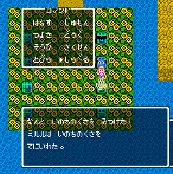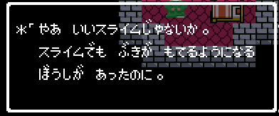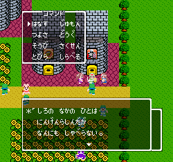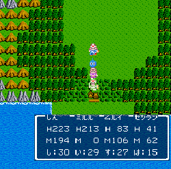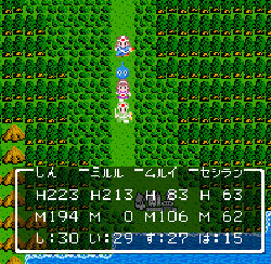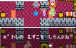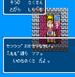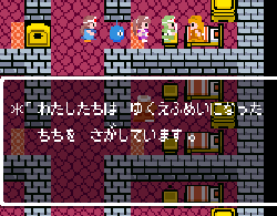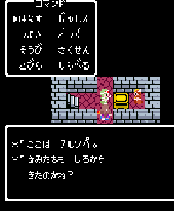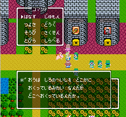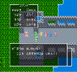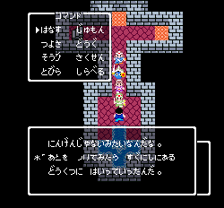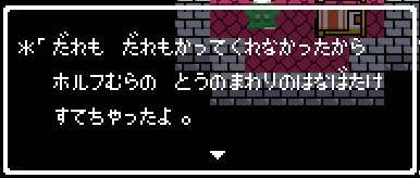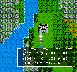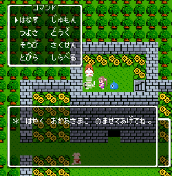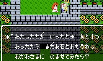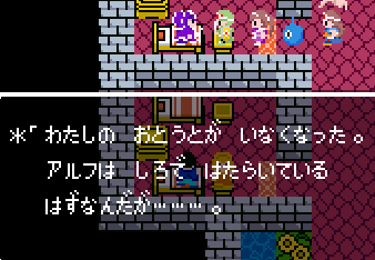 No.505 [TDQ(その2)]![]() 橋を渡って西の大陸に行って北に進むと村が・・・入ってみました。 ![]() ホルフの村ということです(言わなくても書いてある・・ですか) ここには何があるのでしょうか?何もありませんでしたけどね。 だから、今度は南に・・・ また、村がありました。だから(入ってみる、でしょう)・・・そうでした。 ![]() ![]() ここはイフットスの街・・・だとさ。あっ、わかってますか。シツレイ。 ![]() ここには犬の集団がいて、一匹だけが言葉喋れるんだって。その犬が変なことを行っていました。 ![]() もう少しうろうろしているとこんな(右)ところが・・下の階段を降りれば、水の中にある階段に出るのだけど、そこからはカギのかかった扉があって進めません。その向こうには意味ありげな老人が一人。何なんでしょうね。。。 ではこの街を出てずんずん南に進んで行けば・・・ こんなところが。。これって何でしょう。とにかく入ってみましょ。何か街ともつかぬところです。塔(?)らしきところに娘さんが。。。行って話しを聞いてみましょうか。 何何、、、命の草が北西の洞窟にあとひとつあるって。。これを飲めば、元気になるだって。 いままで触れなかったのですが、お母さんは病弱で大変なんです。それなら、母さんのためにその洞窟に行って命の草とやらを取ってきましょうか。親孝行だい・・・ ![]() ![]() ということでテクテクと、歩いていけば・・・ ![]() あったあった・・・ここでんな。はいりまひょ。。 地下一階でみつけたものは・・・ 命の草でした。欲しかったのは、これなんですよね。早速もってかえると・・ ![]() 母さんに飲ませてあげなさいだって。わかってますって。じゃあ、帰りましょうか。 ![]() 母さんがとっても元気になっちゃって・・・![]() 何と、仲間になっちゃった。親子とスライムの仲間なんて・・・ちょっと変、、でも、いいかっ・・父さんを見つけだす旅だもんね。 そしてテクテクと歩いていました。おやっ、ここはまだ行っていなかった街・・ ![]() これは入るしかない・・です。何か、、、(いえっ)・・・タルソパの街ですか。 ![]() 「城からきたのかね」だって・・・城とは? そして、宿に泊まっている人々がみんな城に関して変なこと言っているのです。 ![]() ![]() 城で行方不明になった父を捜している人、城でいなくなっちゃった息子を捜している年老いた父親。。。そして、、 ![]() 弟が城でいなくなっちゃったとか、、国をでたら駄目だとか・・・ 何か、城で起こっているみたい・・・これは、城に行くしかないですよね。うん。 ![]() こんなこと言っている人がいました。スライムのミヌルが武器を持てるようにするには、ホルフ村に帰る必要があるみたいです。 ![]() そして、やっぱり、この国の王は何かにとりつかれてしまっているみたいです。 ![]() ![]() では、ここから出て、まず、ホルフ村に帰りムルイのためにぼうしをGETして城に行きましょうか。。。タルソパの村を出て北に少しいけば、、、、城があります。ここは第一回のショットで見えていた城ですよね。 ![]() ねっ、白の北に見えるのがあの橋です。 第一回で西の大陸から来ようとして門番に拒否されて渡れなかった橋です。 今回は逆から行きますから。。大丈夫かな・・ ![]() 城の東には何やら洞窟が口を開けています。ここも後でくることになりそうです。 で、橋を渡ろうとすれば、、、、 ![]() やっぱり駄目みたいです。仕方ないから大回りしてもと来た道を・・・西に進めばイフットスの村、そこから北に向かえばホルフの村でした。。よね。 ここにある花畑をしらべれば・・・・・ねっ! ![]() それではまたまたぐるっと回って城まで引っ返し、入ってみましょう。しかし・・ ![]() 城のなかに居る人は少なく、何も喋ってくれません。 そして、こんなこと言うひとがいました。洞窟は。。。東にはありましたが、、、多分、そこなんでしょうね。 ![]() では入ってみましょうか・・・・ということで、(その2)はここまでです。やっと冒険の目的が見えてきたような。。。これからですよね。ちなみにセシランのコードもすぐ近くにありました。 ![]() |