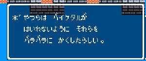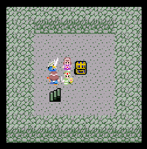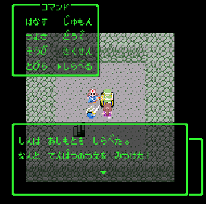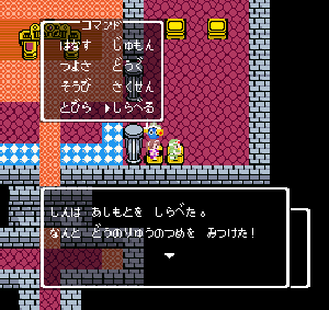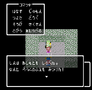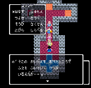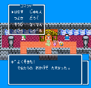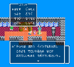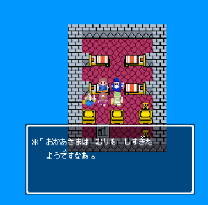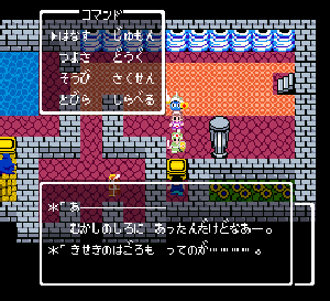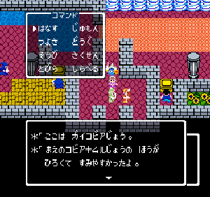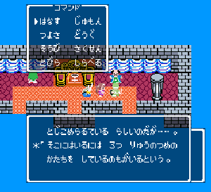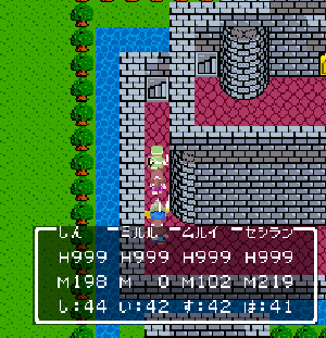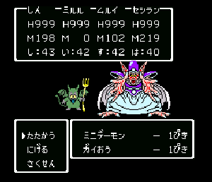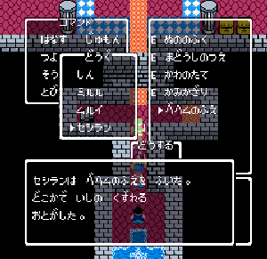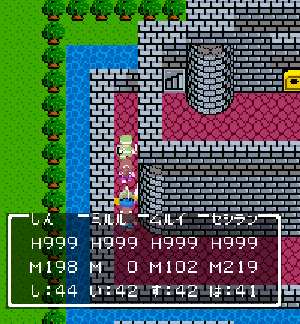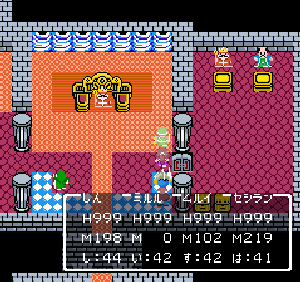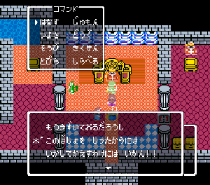 No.506 [TDQ(その3)]![]() 洞窟には宝箱が。。。開けてみると・・・ ![]() 天罰の杖。。何に使うのだろうか? そして、 バハムの笛。。。。あれぇ。。笛といえば、どこかで聞いたことあるなぁ。![]() そうでした。城の地下で兵士がこんなこと言っていましたよね。だから、早速持って帰って、セシランが笛を吹いてみました。 ![]() するとですね。。どこかで石の崩れる音が。。。ですって。どこかで、何かが起こっているらしいのです。早速地下からあがって、、、あちこちを調べてみると・・・ ![]() ![]() どうやら、ここに階段が現れたみたいです(左と右のショットを較べてみてください。。。でしょ)。では早速降りていきましょうか・・・ ![]() 何だ?王様が二人いるじゃないですか??どうやら。こいつは偽物の王様らしいでんな。右のほうにいるのが本物ですか。 兎に角戦いましょ。その前にHPへらないの改造しておきます。これで安心ですから。 ![]() 正体を現わしたのは・・・ ガイ王でした。倒すのはカンタン(だって、あなたは。。HP999の無敵)でぇぇぇ、やっつけた後、いきなりセシランは・・倒れてしまったのでした。 ![]() 歩くたびにHPをへらしていた母さんは、やっぱり無理していたのですね。 もう、これ以上無理させたらあきまへん。 ![]() 母さんはもうルフル村に戻ってもらいましょ。 魔物の持っていたカギくれたんだけど・・どこを開けるのでしょうか・・・ で、城をうろついて、、、今まで開かなかった扉も母さんにもらったカギで開けて・・・そこにある宝箱を開けると・・・ 銅の龍のツメですか。何となく重要なアイテムみたいな気がします。大事に持っておきましょ。![]() 城にいた人たちが喋るようになっていて、こんなこと言うのです。奇跡の羽衣ってのを母さんに着せてあげれば、元気になるのかな。これは絶対に見つけなくっちゃ。 ![]() そして、ここがガイゴビア城ってこともわかりました。 そして、城の最上階にはあの王様がいて、、 ![]() お礼を言ってくれちゃいました。うん、、、 そして重要なことを・・・ ![]() 魔王バイタケルですか。。どこかで聞いたことがあるような・・ ![]() 3つの龍のツメだっか。あれですか。銅の龍のつめ。。ではあと2つみつけなあかんちゅうことでんな。 ![]() 前の城、ゴビアキムル城に行く必要があるみたいですね。。。 ここでmapをみておきましょか。。ちょっと見難いのですが、タイトル画面の出てくるバックにあるやつです。 ![]() 始まりの村ルフル(LUFLU)があって、その南にマログリフル(MAROGLIFLU)です。橋を渡って西にいけば、北にホルフ(HOLFU)、南に下がってイフットス(IF−TOS)、ぐるっと龍の顔のかたちをした入り江を回ってタルソパ(TALSOPA)です。そこから北にガイコビア(GAIKOBIA)です。 次の舞台コビアキムル(KOBIAKIMLU)は東の端を渡った大陸にあります。これで大体の位置関係はわかりましたよね。さて、次の舞台は・・・ |