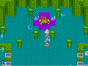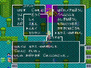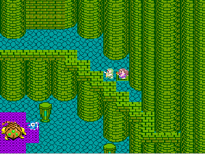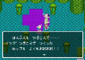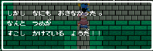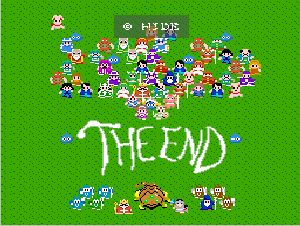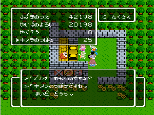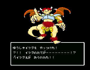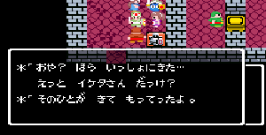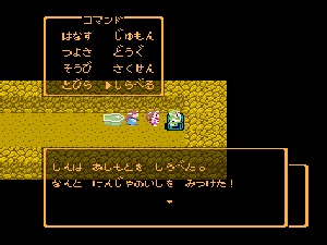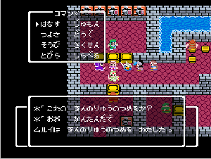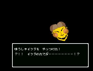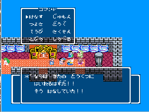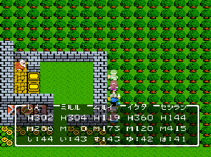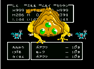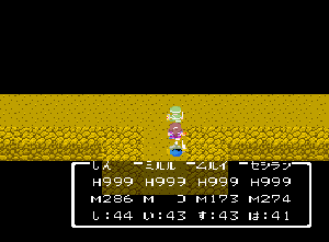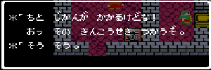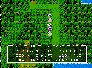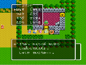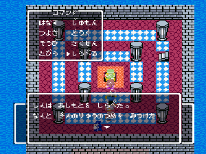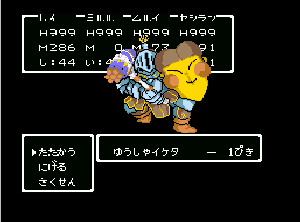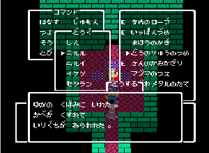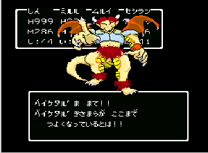 No.508 [TDQ(最終回)]![]() ルフルの村に帰ると母さんのセシランがまた仲間に加わってしまいます。体弱いのだからそんなことしなくてもいいのに、と思うんだけど、まあ、仕方ないか。これで5人編成だい。 さて、銀の龍のツメは。。。まず、砂漠の北にあるホコラへ。。。 ![]() ここのおっさんはキメラの翼を売ってくれます。 ![]() そして、ヒントは。。。「太陽の石」です。わかっていますよね。うん、、、 ![]() ぬぬぬぬぬ・・・・・ ![]() ありましたよね。らしいところが。。。 ![]() やりました!!銀の龍のツメです。こんなところにあったのです。ふぅ・・・ ![]() またまた王様のところに。。。すると、こんなことを。北の洞窟ですか。ふむふむ・・ ![]() 確か・・・ホルフの街の北東にこんなところがあって・・ ![]() その先にホコラが。ここが北の洞窟らしい・・・ ![]() 進んでいくと行き止まり。そうです!ここでツメを使うのです。まず、銅の龍のツメを・・ ![]() そして、銀のツメです。 最後は金の流のツメですよね。ところが。。。こんなことが。壊れていrたのです。では、修理が必要ですよね。なぁぁぁるほど、ここで修理屋ですか。ありましたよね。あそこにLet’s Goooooo・・・ ![]() やっぱね。修理は簡単だそうです。 でも、金鉱石を持っていないとだめじゃぞ。。![]() 修理している間にルフルの街に帰って・・・・ ![]() 話しをしていると、こんなこと言っていました。これって重要なヒントでしょうか。 ![]() でもって、もう修理が終わった頃だと思って帰ってみると、イケタが持って行ったということでした。何か変・・・・・・ ![]() 行ってみると。。。扉は開いていました。 ![]() 地下迷路に通じていて、途中に賢者の石とかあって、 ![]() ここはループ迷路らしい。。そして、あのヒントがこのループを抜ける答え、、だと思います。「4つ降りて1つ登る」でも、どういう意味や。。。 ![]() ウロウロしていると、こんなところに。下に見えるのは何か?でも、どうして行ったらいいのか・・・・ ![]() と、訳のわからないままにこんなとこに出てきました。 イケダ???どうしてこんなところに。。 ![]() やっぱ、ここだったのですね。ラッキー!! ![]() いましたか。何やら変な大ガマがえる。 ![]() ど、ドヒャー!!こりゃ、何じゃ。 ![]() こいつはカンタンにやっつけて。。と、現れたのは、イケダ。何で? ![]() 何と、イケダは・・・・・・ ![]() でも、こいつもあっさりとやっつけた、、かと思いきや・・ ![]() バイタケル・・・・・・・・ ![]() しかし、こいつも・・・ ![]() そして、そして、感動のエンディングが・・・無事助けられた人々がぞろぞろと・・ ![]() ファミコンのスプライト機能では絶対にできないことです。うううん、感激! ![]() でした・・・・・・ ![]() ここでひとつだけ念のため。あの最後最後の無限ループの謎は結局解けませんでしたが、ループを抜ければ、こんなところに降りてきて、 ![]() 上の暗闇のどこかに階段が・・・ ![]() これを捜すのはカンタンです。 ![]() そして、最後のボスのところに来るのですが、こいつが強い。だから、やられても、すぐにここに帰れるように、戦う前にルラミのめすいしを使っておくことをお奨めします。多分、すぐに来てボスと対決できると思います(確かめていませんが・・・) ![]() どうでしたでしょうか?面白かったですか。本当の面白さは、やっぱり改造なしでやらなくてはわからないのでしょうね。ムルイの武器を捜したり、最強の装備を捜したり、そんなところにおもしろさはあるのでしょうが、改造しちゃえば、そんなことしないですもんね。 だから、みなさんは、改造なしでじっくりと遊んでください(勝手な・・・・) というわけで、「TDQ」でしたが、「TDQ2」もやりたくなっちゃいました。でも、そんなスタミナは・・・・考えておきましょ。 |
