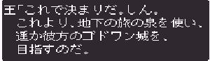 No.513 [TDQ2(その5)]![]() ここがラーテの洞窟です。入ってみましょか。 進んでいけば、こんなところがあります。でもって、ここの位置で落ちてください。ここですよ!! ![]() で、無事、着地・・・・・ ![]() これでしょう、多分・・・ ![]() お城のタイマツにも点火されて明るくなっちゃいました。よかたでしゅ。 ![]() そうしているうちにアラキが骨の文字を解読した。・・・・その結果、探し求めていた勇者は・・・・・・シンだったのだ。 勇者はみんなの希望だ。街の人々は驚きと畏敬のまなざしでシンをみる。そして、こんなことを・・・![]() そして、王様から次ぎの旅の目的が伝えられた。 ![]() そして、・・・・ ![]() ![]() ということで・・・・ さて、出発です。これからが本番ですかね。![]() やってきましたゴドワン。 ![]() 上の建物にいたおじいさんが、こんなことを。戦士とは幼なじみのあいつだろうか? ![]() 冒険の旅、第2章の始まりです。ということで・・・今回はおしまい。 どうなっていくのでしょうね・・・・・・・・・・・ |