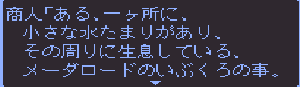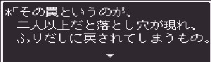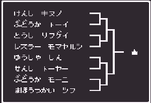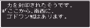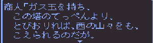 No.514 [TDQ2(その6)]![]() やってきた北のホコラはここ。中に入ると塔になっていて(何でや)こんなおじさんがいて、 ![]() いろいろ教えてくれるのでした。バイタケルってあの「TDQ」の・・・ ![]() フムフム・・・南西ですか。 ![]() ちょっと階段があったので登ってみました。うううんん、絶景、絶景・・・ ![]() 南西に進むと村が、トトンでした。 ![]() そしてここがゴドワン城。 ![]() トトン村でこんなことを言うおじいさんが。聖なる種火ですか。 ![]() 王様も余程困っているらしいのです。 ![]() 種火を盗んだ盗賊は・・・・・・ ![]() では行って来ますか。でも、二人連れでは行けないとか・・・ ![]() ![]() だからオルスフールへルーラで飛んで、そこでチオレと別れました。 ![]() どうやら、あれがリハマロの塔。 ![]() で、塔にはこんなとこがあって。 ![]() こうきて ![]() 綱渡り・・・ ![]() いました。 ![]() プアーはまた逃げていったけど。。。 ![]() さて、これでメキヒの種火は持ってかえったし。。。いよいよですか。 ![]() 決勝進出は8人。 ![]() そして戦う相手は・・・ ![]() でも、ちょっと待ち時間が長すぎるぅぅぅ。退屈で退屈で・・・・ 第1戦は・・・ ![]() そして第2戦 ![]() 決勝は・・・ ![]() そして表彰式 ![]() しかし、思わぬことが・・・・ ![]() リフゲイは魔物の仲間だったのか・・ ![]() そしてトーイとモーニの二人の姉妹が仲間に・・・ そしてそして、次の旅の目標は・・・コビアキムル城 ![]() 「白竜の眼」ね・・・・それを取り戻すか ![]() もうひとつ、「銀のマルス増」ですか。これを捜して濡れ衣をはらさなくては。 ![]() もうひとつ情報。 ![]() カロシスの剣とくればカロシスのかぶとですよね。これはローシですか。忙しくなりまっせ。 で、テクテクと北西の方角へ・・・こんな塔がありました。 ![]() そして、その中に・・・・ ![]() ガス玉を売っていたのですが・・・・ない。西に行くには絶対必要。困った。 ![]() 商人はいいことを教えてくれました。となれば、北のエブレ山の洞窟にいくしかありません。 ![]() ![]() ということで、今回はここまで。。。。。To be continued・・・・・・(^^;; 改造コードをもう一度 ![]() もうひとつ・・・・・ネタバレ情報。岩のピラミッドでの見えないものとは、、秘密の通路でした。ここから進んでいけば、黄金のツメが手にはいります。 ![]() |