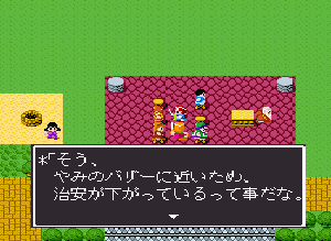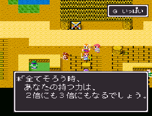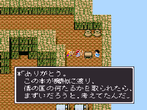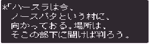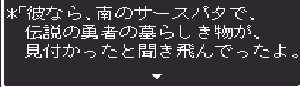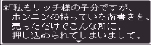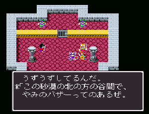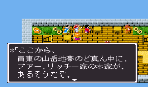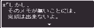 No.518 [TDQ2(その10]![]() ちょっと位置の確認です。左上の村がホンニンが住んでいたというカール。下に広がる砂漠があのシンの村やピラミッドのあった砂漠。そして、右上にチラッとみえるのが、リッチたちがいるリスアモの塔です。 じゃあ、リスアモの塔にいきましょう。しかし・・・リッチはいなく、いたのはホンニン。 ![]() しかし、大切なメモが盗られてしまって、完成できていない・・・ ![]() 宝箱があったので開けてみました。これってどんなアイテムなんでしょうか? ![]() どうやら、あのメモは・・・・ ![]() 闇のバザーにあるみたいです。白竜の眼もそこにあるというし、絶対に行ってみなくては。でも、そこは・・・ ![]() 倭の国でやることは、この遺跡を見つけること、、なのか。 ![]() なになに。。。闇のバザーはこの近くだって、、、 ![]() これは、リッチのいるところの情報です。 ![]() 闇のバザーの情報がありましたよ。 ![]() でもって、見当をつけてウロウロ・・・ここ、何か怪しいなぁ・・・ ![]() でも、入れない・・・・ハスラーと知り合いみたい・・・ということは、ハスラーのとこに行って相談するしかない・・・か ![]() しかし、ハスラーはひとりでどこかに出かけてしまって・・・ ![]() ということですか・・・・ ![]() そして・・・・ ![]() で、聞いたのです。すると・・・ ![]() ということですから、またまたルーラでカールの街に飛んで・・・っと。 言われた通りにやってきました。あれが・・・ ![]() 中にはいれば・・・ ![]() 情報を集めます。 ![]() ハスラーは・・・ ![]() じゃあ、南サーパスタに行くしかないですよね。その前にここの北にあったホコラに入ってみました。 ![]() すると、ワープゾーンでした。 ![]() ついでだから日ってみました。・・・・ここでした。砂漠がみえますから、あそこ、です。 ![]() で、気を取り直して南へ南へ・・・あそこに見えるのが、多分南サースパタ・・・ でも、どうやって行けばいいのだ・・・ ![]() 一見行けそうもなかったのだけど。。。無事、到着。 ![]() 中に入るとイミルフの墓が。そしてイミルフとは・・・・だったのですか。 ![]() これが墓ですか・・・ ![]() ハスラー発見。 ![]() 宝箱の中には黒竜の牙でした。 ![]() さて、ハースラも仲間になったことですから、行くは闇のバザーですよね。ルーラで一気に・・・ ![]() な、な、な、何だって、ホンニンのメモは売れてしまったなんて・・・・ ![]() 種火をすべてそろえると、、、、ふぅぅん、そうですか。 ![]() ありましたよ・・・・・ ![]() ということで、ゴドワン城に行って白竜の眼をわたしてあげましょ。 ![]() 今回はここまでにしておきます。まだまだ終わりがみえてこないのですが、10回目になってしまいました。いつまで続くのでしょうか?おじさんにもわかりません。 MAMEもb15がリリースされたみたいですが、、、ううん、イマイチですかね。 でも、楽しみ。。 |