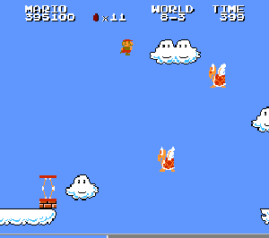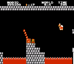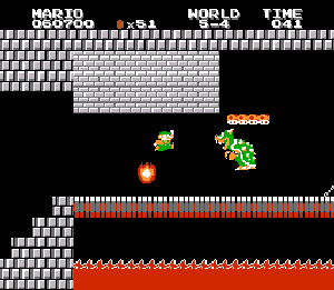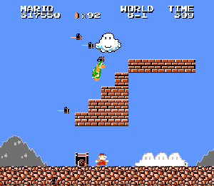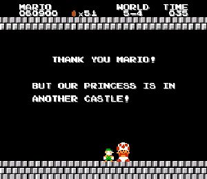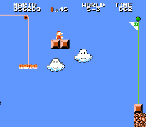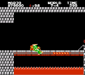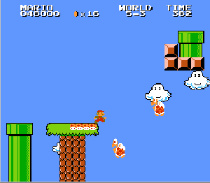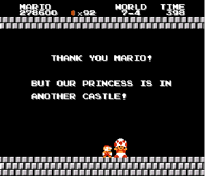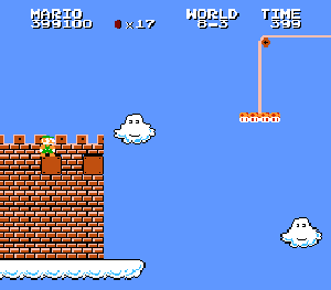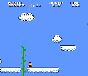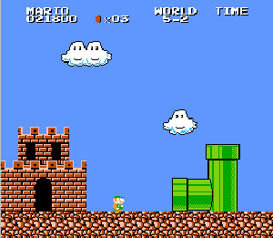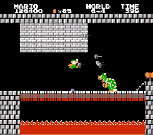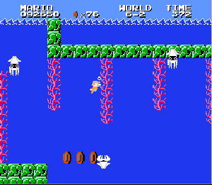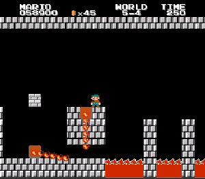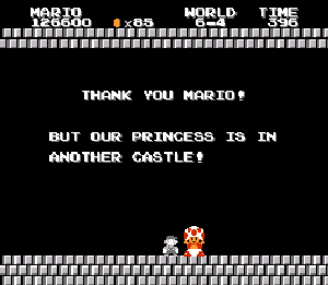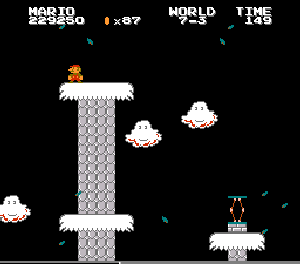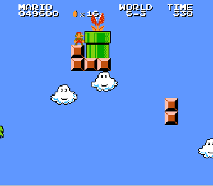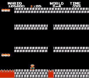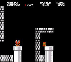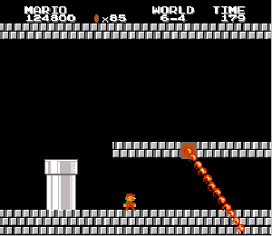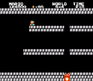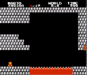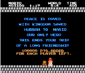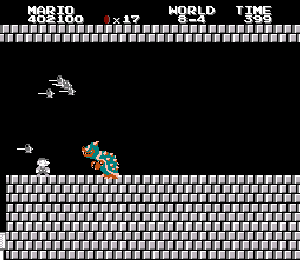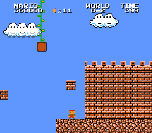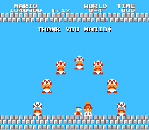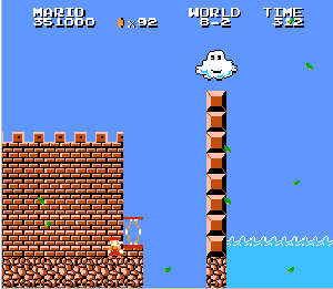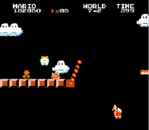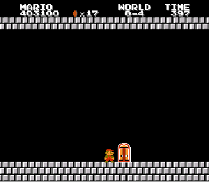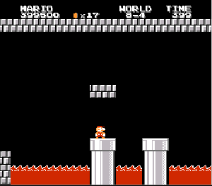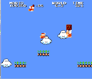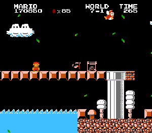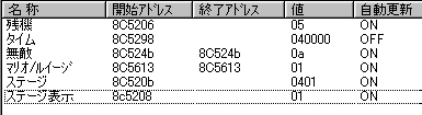 実は言い忘れているのですが、このスーパーマリオの残機サーチですが、表示数−1でサーチしてください。でないと見つかりませんから。参考までチャンチャン・・でした。![]() 5−2なら 04 01 のデータになります。 ただ、これだけでは画面表示がおかしいですから、もうひとつデータを変えてやってください。これで一気に8−4にいけます。そのためにはここに 07 00 を入れればいいということですよね。 でも、ここは真面目に(?)5−2から再開です。 結局、最後までいきましたが、インチキして飛ばさなければならないステージはありませんでした。そのショットを紹介します。 中には知らなければ、いつまで経っても前に進めないループ面がありますから、それはこのショットを参考にして進んでください。