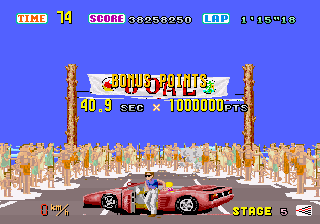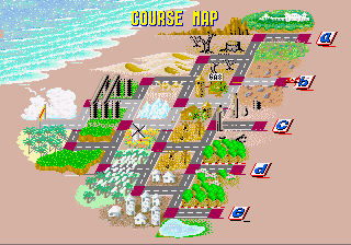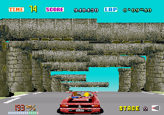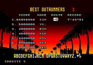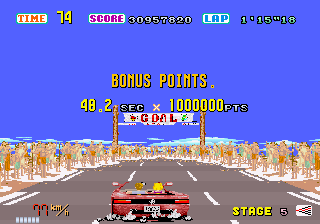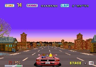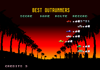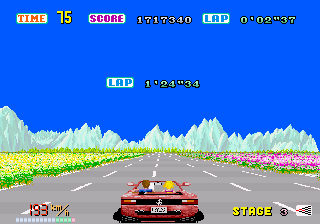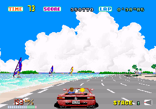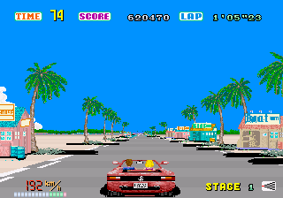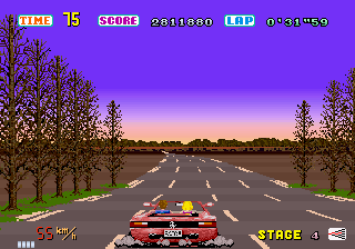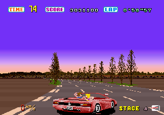 No.558 [アウトラン]![]() 今回はあの名作「アウトラン」です。改造は前回紹介しましたから、そちらを見てください。タイムを減らなくしちゃいますから、のんびりとドライブしちゃってください。このゲームは音楽と風景が素晴らしかったですね。と、言ってもMAMEでは音楽の方がちょっと未完成ですか。。。そして、これってあのFINALBURNにも対応しているのですが、、、こっちは背景が出来ていませんから、ちょっとやってもおもしろくないでしょう。と、いうことで、このMAME版です。 ゲームセンターではつい最近まで動いていた(?)ような気がしますが、1986年の作品なんですよね。スーパーマリオがファミコンで登場した頃ですから、やっぱり凄いゲームだったんですね。 まあ、このゲームのウリである広がる美しい風景、ゆっくりと眺めていきましょうか。 今回紹介したのは1つのルートですが、他のルートも走ってみたいと思うでしょ?勿論、彼女と一緒に(いいなぁ・・・・・)