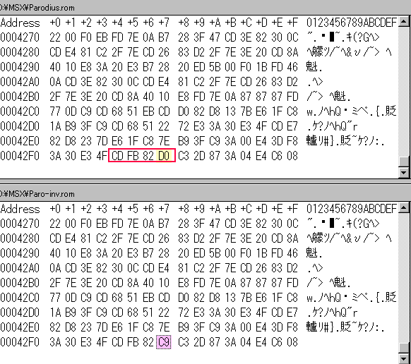 No.604 [パロディウス MSX]![]() MSX版「パロディウス」です。記憶では一連の「パロ」シリーズの元祖だったのではないでしょうか。そして、これはおじさんの想像なんですが、これって最初はコナミのプログラマーさんがお遊びでつくったゲームだったのではないでしょうか。。。それがバカうけしてしまい、最初の思惑とは違ってどんどんシリーズものがつくられていったと。。。まあ、多分ですけどね。 とにかく、その記念すべき元祖「パロ」です。 でも、今回はちょっと手抜き。。。。 実は、この無敵版を何故か手に入れてしまったのです。こんなことよくありますよね(でもないか)。この次に予定しているMSX版「沙羅曼蛇」もそうですし、SF版「ドラキュラ」もそうでした(と、言っても、この3つだけですが) だから今回は改造なしで、この無敵コードを紹介しておしまいということにします。ゴチャゴチャするより、すっきり無敵。思いっきり遊んでください。だって、このゲームはとってもムズイ・・・・ コードのサーチはExSTANDでは出来ないので「Binary File Compare」という優れものツールです。あるのはここ。KBOさんのつくられたフリーソフトです。そういえば、昔はCompareを使ってよく改造しましたよね。 画面はこんな感じです。すっきりしていていいでしょう。色のかわったところが無敵版と通常版のデータの異なるところです。ひとめでクッキリですか(何や)。アドレス00042f7のD0をC9に替えてやるだけでいいみたいです。 ![]() これをExSTANDでコード化します。 やり方はカンタン。サーチは例えば、{LD082FBCDh}出てくるアドレスは多分1カ所。そしてD0をC9に書き換えてやればOKです。「パロディウス」にはもう一カ所書き換えてやる必要があります。やり方は一緒です。これが こうなったら無敵なんです。 さて、それではいきましょか!華麗でひょうきん。しかし、極悪なゲームのショットは次回のお楽しみ(何でや。。。チョット疲れぎみ)ということで・・・・・・・・・・・・・・・・・・・・・・・・・・・・グゥ |