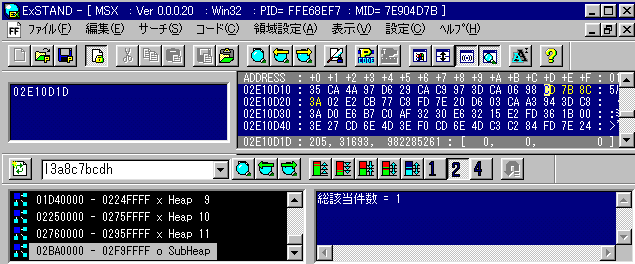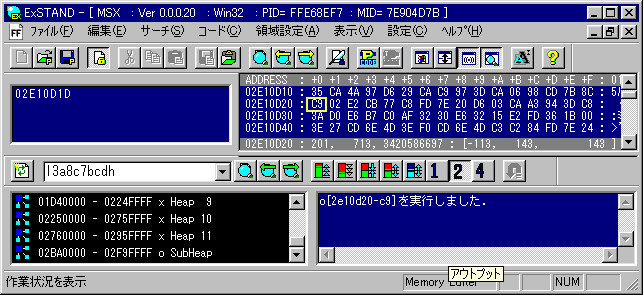 No.605 [沙羅曼蛇 MSX(設定編)]![]() MSX版「沙羅曼陀」はすっごく難しいですね。実を言えば、2ステージさへ見たことないのです。これって、おじさんにとっては超極悪ゲームです。でも、当時、ソフト量販店の大型画面で、キーボードを操ってスイスイ遊んでいる高校生のお兄ちゃんがいましたから、世の中やっぱ、いろんな人いるもんだと、その時も思ったもんです。 で、今回はムテキですから、それ以来見たこともないMSX「沙羅曼蛇」の世界をじっくりと見ていきましょう。 その前に改造です。やっぱりBinaryFileCompareを使います。何故かムテキバージョンをいつの間にか入手していましたので、今回もExSTANDによる改造はしませんでした。でも、これってシールドが前方方向の敵弾だけにしか効果がありませんから、いつものサーチではムテキにできないのでしょうね。 まず、ノーマルファイルとムテキファイルの比較した結果。違っていたところは、この一カ所でした。これが通常版。 そしてこれがムテキ版です。違っているところは色がかわっているところ1カ所だけ。 さて、このことを知った上でExSTANDでデータサーチをして、コード化しましょう。まず、サーチです。やりかたは下図。わかりますよね。アドレスはSubHeapにありました。次はコード化です。 ![]() やりかたは下図。これでムテキのできあがりです。でも、このコードはどんな意味をもっているのでしょうか?どなたか教えてください。これさへわかれば、ムテキ化もレベルアップするのでしょうが、、、 ![]() ということで、今回もここまでにしておきます。次回でたっぷりスクリーンショットをお見せしますからオタノシミニ。と言うより、このコードを入れたあなたにはもう必要ないかもしれませんよね。 それにしても、何とかディスアセンブラ勉強したいのですが、、まず、検索サーチでもしてみましょうか。いいものあったら、教えてくらはい。お願い。 |