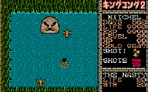 No.623[キングコング2MSX(その8)]![]() さて、沼地の北が開けましたので、いつものようにMAPからです。 最初にある小屋での情報はこれ。赤い岩の番人というからには、その先に見える西に抜けるのを塞いでいるあの赤い岩なんでしょうね。、 ![]() そこには後で行くことになるでしょうから、その前にやるのが、この岩を消すことでしょう。![]() 消せば、いつものように階段が現れて・・ ![]() 降りていけば・・・更に階段があり ![]() ちょっと強そうなやつが、、、と思いきや、、とっても弱く ![]() 倒した後にはカギが・・・ いたのは酋長。助けてあげたらまかぷらの呪文をくれました。これさへあれば・・・![]() ここですよね。こいつを倒すことが出来る。で、あっさりと倒しちゃいました。 ![]() すると、モリを残して、うしろの通路が開きました。また、世界が広がりました。 とりあえず、ここは後でということにして元の場所に戻ってこいつと戦います。ちょっとてこずるかな。。。とおもったのですが、ツメであっさり・・ しかし、同じようにどん詰まりにいるこいつはカンタンにはいかないだろうと思ったのですが、、、あっさりと。そして・・・ ![]() ![]() 赤い岩が消え、さらに西への通路が開かれました。この先はどうなっているのでしょうか・・・ というところで、今回はここまで。 ワクワク(^^;; |