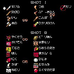 No.625[キングコング2MSX(その10)]![]() けむらんといえば、何かあずかっていましたよね。早速いかなければ・・ 途中にいるこの海坊主はモリでやっつけちゃいましょ。![]() たどりついたけむらん。お礼にコングの瞳をくれました。 これがあれば暗闇に明かりをともすことができます。ありがたや・・・ テントですか。。。![]() その前にいしを消して、いつもの階段。ここを降りていけば・ ![]() 何やらお宝が。。 ![]() そしてずんずん進んで行けば。。。テントが。そこには 壊れた無線機がありました。 ということでお宝の確認です。コングの瞳、無線機、そして、らくなの玉です。![]() 途中でこんな情報を変なおじさんから。らくなの玉と 言えば、さっきとったお宝ですね。 この先は神殿?そして、そこにコングの叫び? ありました。これがコングの叫び。そしてちからの玉・・・・・・![]() 修理ということは、ここで壊れた無線機を修理するのでんな、きっと。 それにしても上に見える田の字のマークは???? ![]() さて、もう少し進んでみますが、ここはいきどまり。 コングさまのちからですか・・・ 兎に角この黄色い岩は今は駄目みたい。ということで、ここはコングの瞳を入手したことですから、あの闇のブロック地帯に行ってみましょう。![]() コングの瞳を装備して入ってみたところです。この先には何やらピンクの怪物が。 ![]() まず、手前のブロックにいるやつらを全部倒すと・・ 炎の玉という武器。 そして、奥のピンクを倒せば・・・あぐのすというカギでした。![]() さて、、、ここですっかり行き詰まってしまいました。途方に暮れていたら、、こんなとこに(ウソ) 兎に角ここでさっき取った力の玉、つかってやりましょう。と、、、、![]() その先はこんな感じ・・・何かありそう、、、ということで今回は期待を残して、ここまで。さて、この先はどうなりますか・・・ワクワク(^^;; ![]() |
