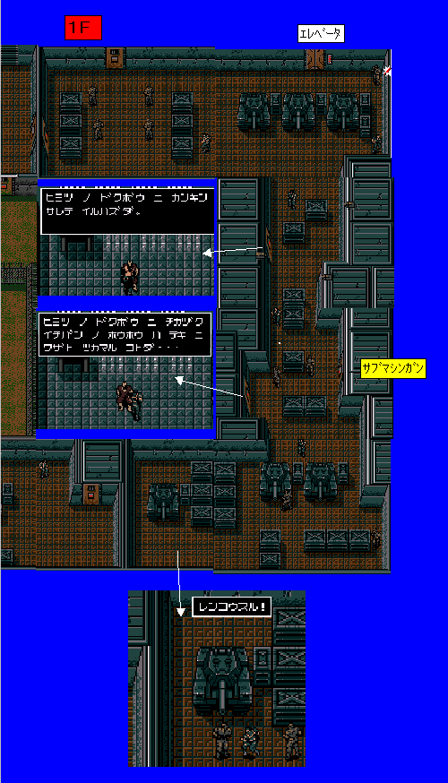 | No.631[メタルギアーMSX(その3)] カード2を取ったら引き返して任務を果たしましょう。黄色で示されているところが、この3階でのイベントです。アイテムをとって、捕虜を次々と助けていきます。そして最後には右上のエレベータで1階に降りて行きます。 ここで操作キーの説明をしておきます。パンチはM(N)、ショットはSPACE、武器の選択はF2,アイテムの選択はF3、レシーバーはF4です。最初、ちょっと戸惑っちゃいましたから書いておきます。JoyAdapterなんか使っているかたはこのキーをABCDボタンに割り振ればいいですよ(おじさんもそうしています(^^;; ![]() ![]() 1階での仕事は捕虜を二人助け出すことですか。。。そして、下の行き止まりで連行されることです。 いよいよおもしろくなってきました。。 この「ソリッドスネーク」はあのプレステに移植されたのでしたよね。でも、やったことありません。いつか機会があればやってみたいのですが、、、これも多分、、、、、まあ、人生はまだまだ長い。楽しみにとっておきましょ・・ と言うわけで今回はここまで、、、 でも、最近大きなMAPを掲載することが多くなったのですが、メモリーがいつまでもつか。。。 みなさんも覚悟しておいてください。いきなり、中断する、なんてこともあるかも TO BE CONTINUED!!! |